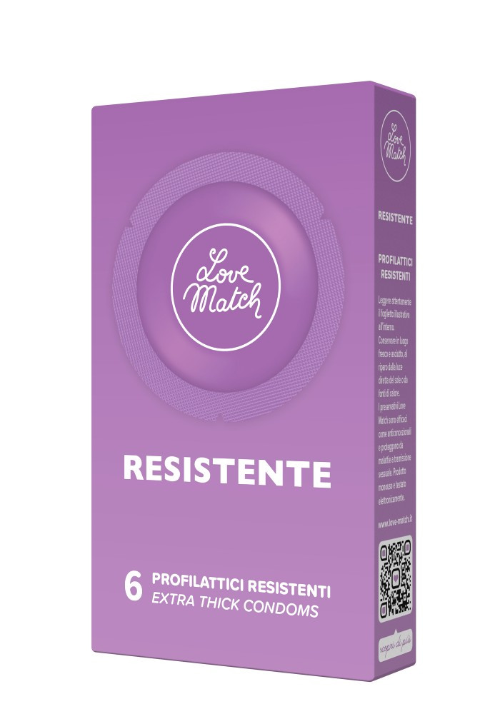 Preservativi resistenti. Più spessi e più lubrificati dei preservativi classici offrono sicurezza e vestibilità a chi ama le esperienze più audaci: i Love Match Resistente sono particolarmente indicati per il sesso anale.I Love Match Resistente sono preservativi un po' più spessi, e perciò più resistenti dei preservativi classici, dalle dimensioni confortevoli e dalla qualità unica.