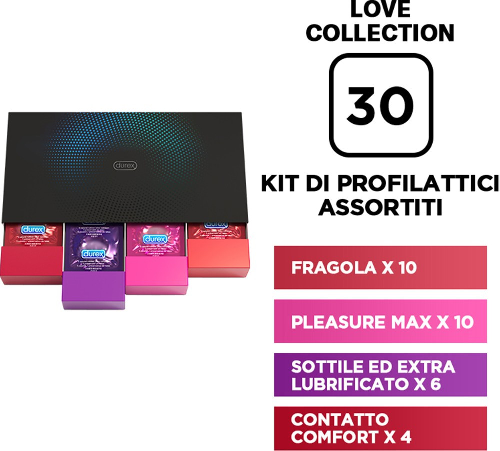 Cofanetto contenente 30 profilattici suddivisi in profilattici Aromatizzati alla Fragola, Stimolanti e Sottili.Scopri il comodissimo cofanetto Durex Love Collection per poter scegliere sempre il profilattico giusto per qualsiasi occasione!Durex Love Collection è composto da 30 profilattici assortiti di 4 tipologie diverse, pronti per poter soddisfare ogni tua fantasia in assoluta sicurezza.Con il formato chocolate box, il cofanetto è poco ingombrante ed è composto da quattro cassetti con le rispettive tipologie di profilattico per poterli poi conservare in modo pratico e discreto.Durex Love Collection è composto da:-10 profilattici aromatizzati alla fragola, per un dolce divertimento accompagnato da un intenso aroma alla fragola.-10 profilattici Pleasuremax, preservativi stimolanti con nervature e rilievi che ti garantiranno un'elevata stimolazione e renderanno il rapporto sessuale magico.-6 profilattici Sottili ed Extralubrificati che ti garantiranno un rapporto sessuale con una stimolazione del tutto naturale e con una lubrificazione intensa e travolgente.-4 profilattici Contatto Comfort, profilattico ultrasottile che ti farà dimenticare di indossarlo e ti regalerà piacevoli sensazioni con una stimolazione naturale e intensa.